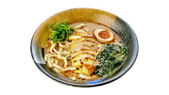 Ramen noodles, broth, beef, spinach, shimeji mushrooms, marinated egg, green onion, nori